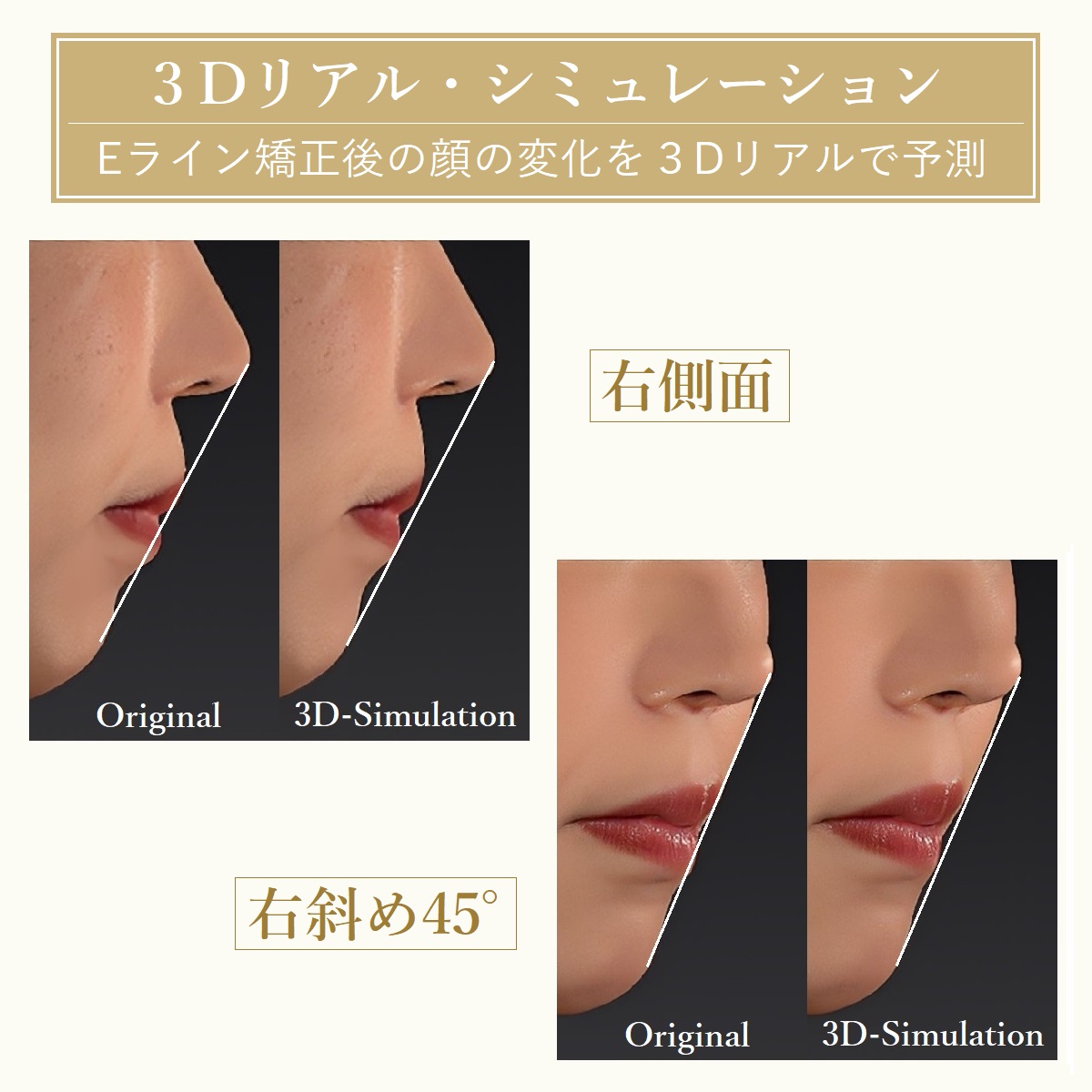カウンセリングで何㎜Eラインを下げるのが理想かアドバイス、3Dシミュレーションいたします。
