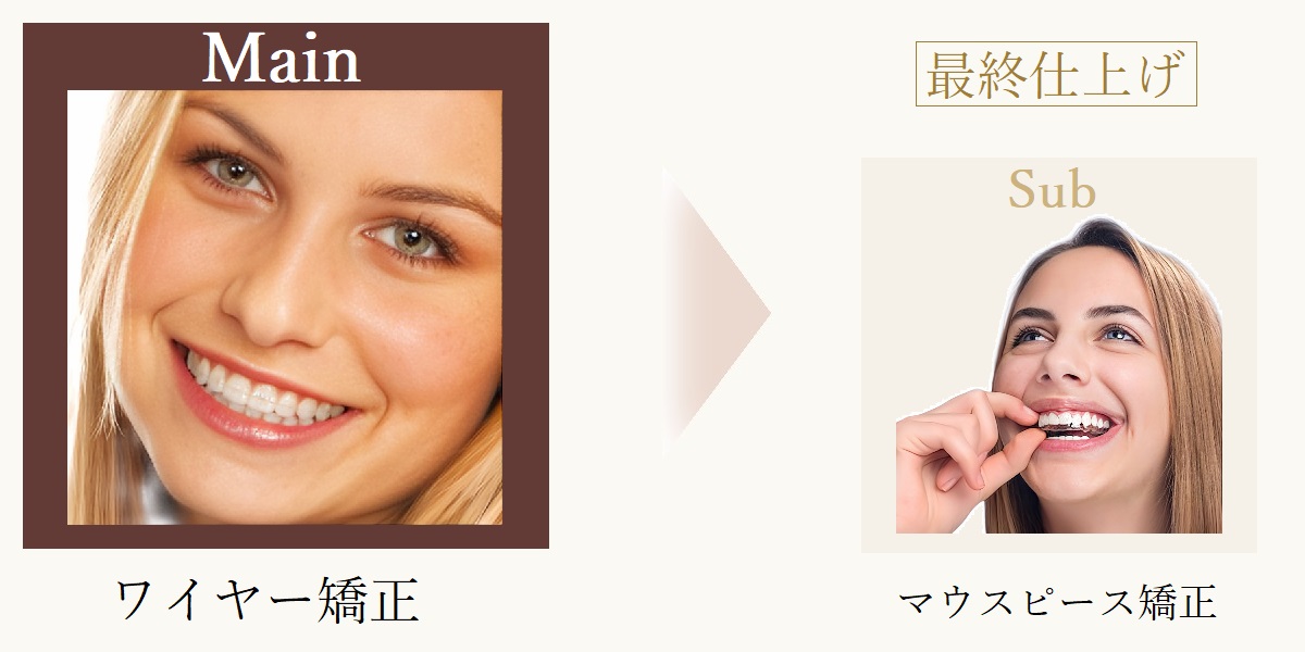 ワイヤー矯正をメインに歯を移動させ、その後にマウスピース矯正で微修正をし、完成度を高めます。