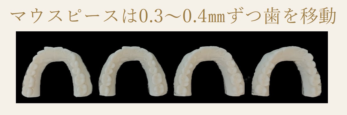 コラボ矯正で使用するマウスピース矯正では、歯を確実にコントロールするために、1個のマウスピースで歯を0.3~0.4㎜ずつ歯を移動させていきます。