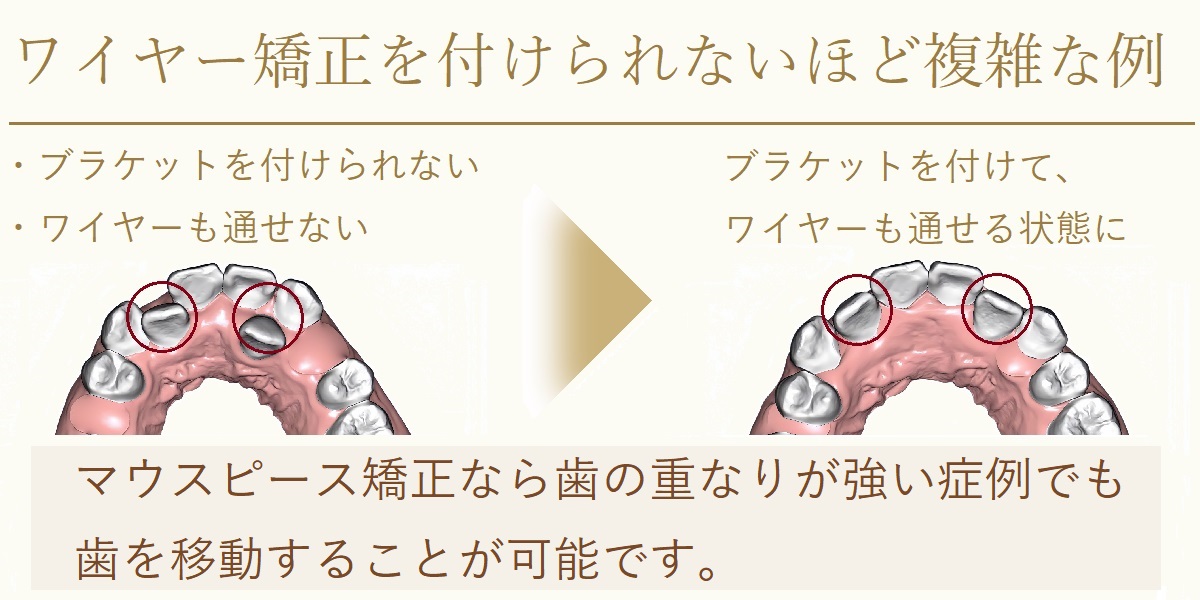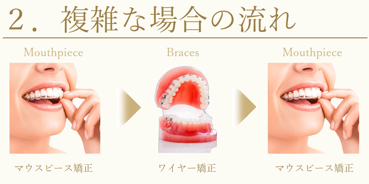 歯並びが複雑で、最初から全ての歯にワイヤー矯正の装置が付けられない場合は、最初にマウスピース矯正でワイヤー矯正の装置が付けられる状態にしてから、ワイヤー矯正に移行します。最後にマウスピース矯正で仕上げます。