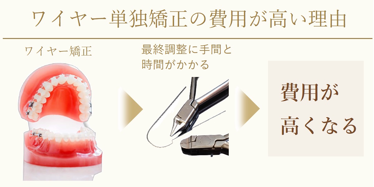 ワイヤー矯正の単独治療では最終の微調整の段階で少しずつワイヤーを曲げるなど、歯科医師の手間がかかり診療回数が増えて、その分の費用が高くなります。