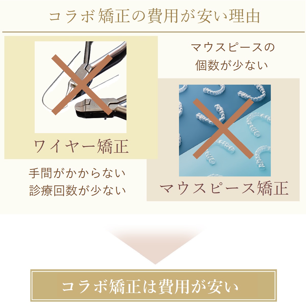 コラボ矯正は、ワイヤー矯正の診療回数が少なく、マウスピースの個数が少ないので治療費が安くて済みます。