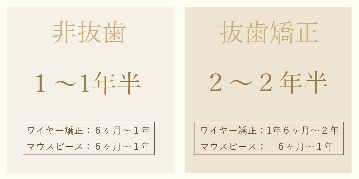 全てをマウスピース矯正の単独で治療する場合、1個のマウスピースで歯を移動できる距離が0.3~0.5㎜と限界があるので、マウスピースの個数が増え、治療期間が長くなります。