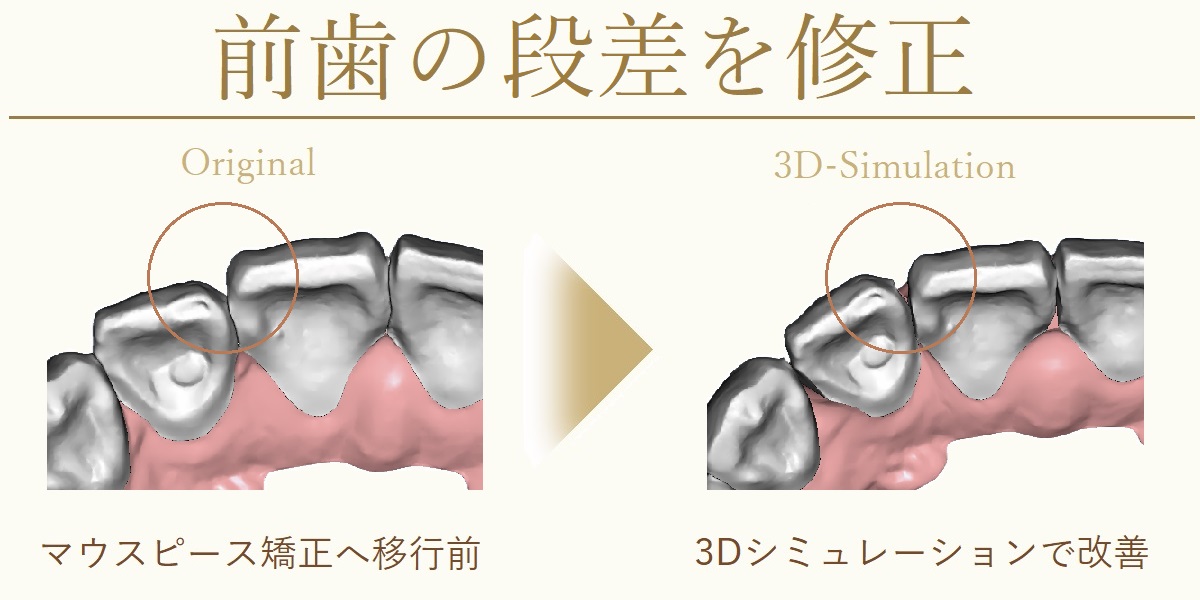 ワイヤー矯正の後、前歯に少し段差が残っても3Dデジタル・マウスピース矯正で、段差のない真っ直ぐな前歯をシミュレーションし補正します。