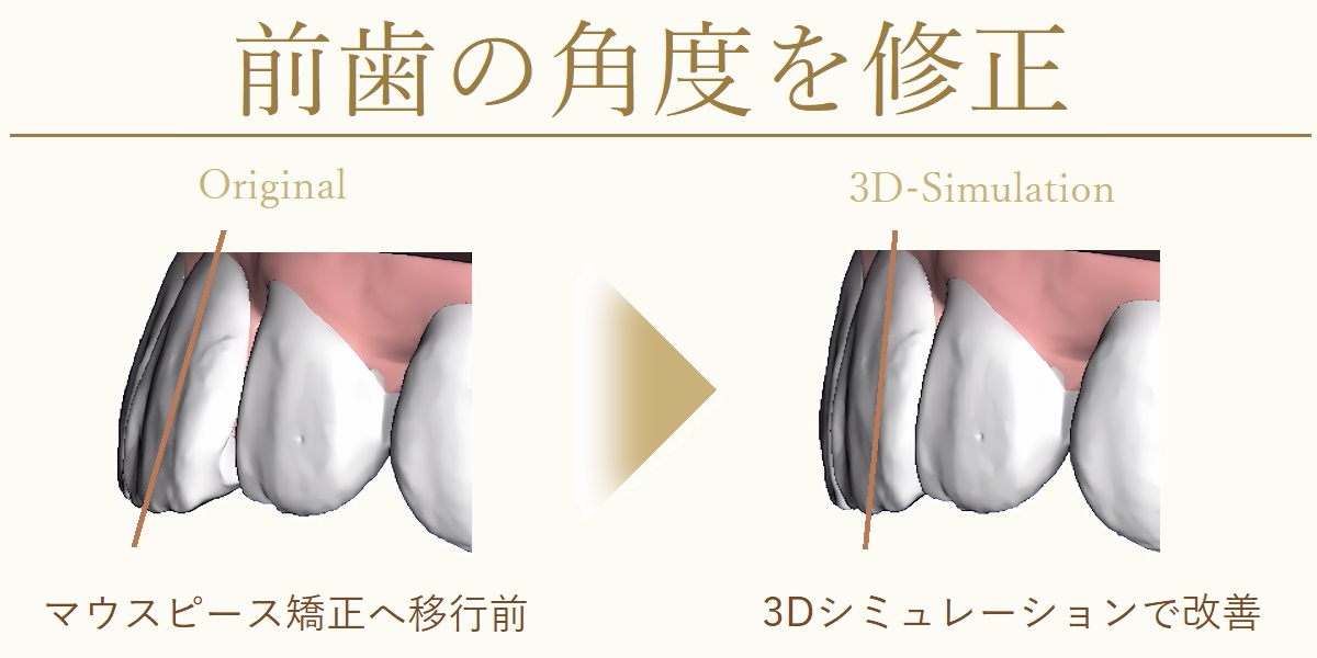 ワイヤー矯正の後、前歯が斜めに傾いていても、3Dデジタル・マウスピース矯正で、垂直に近い前歯にシミュレーションし補正できます。