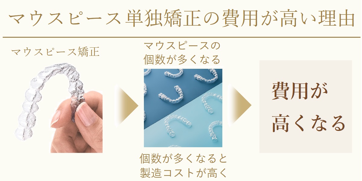 マウスピースの単独矯正ではマウスピースの個数が多くなり、その分の製造コストが高くなります。