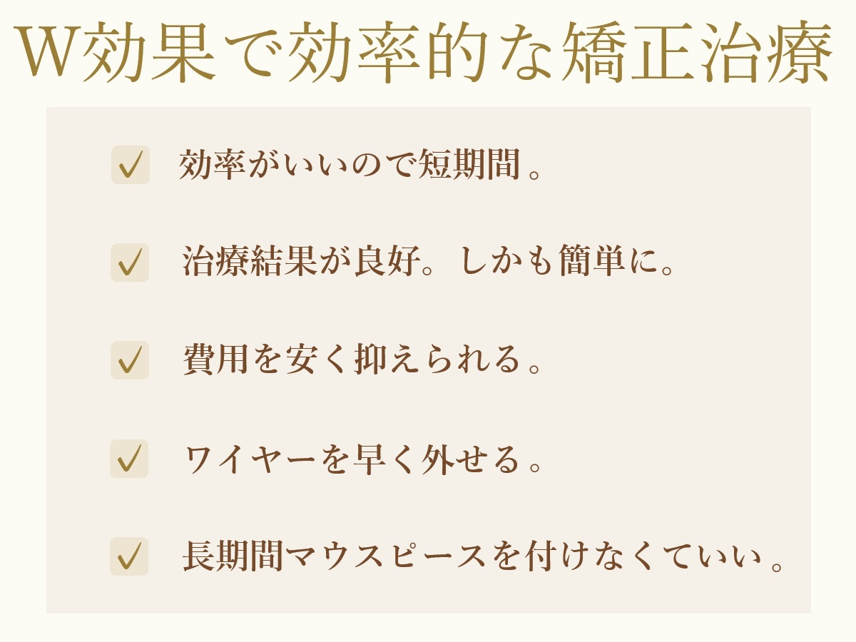 ワイヤー矯正単独またはマウスピース矯正単独の治療よりも短期間で完成度が高い矯正治療をおこなえます。