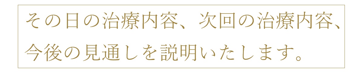 TBDC新宿院では、その日の治療内容、次回の治療内容、今後の見通しを説明し、患者様が安心して通院できるようにいたします。