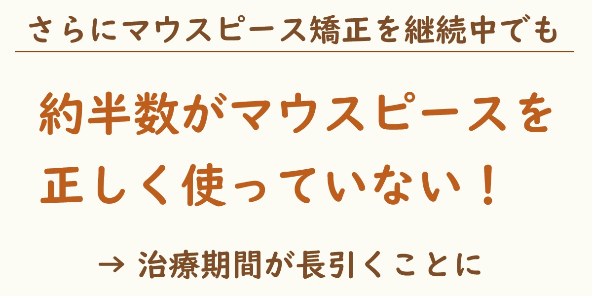 またマウスピース矯正を継続中でも、約半数がマウスピースの装着時間が短いなど、正しく使えずに治療期間が想定よりも長引く傾向がございます。