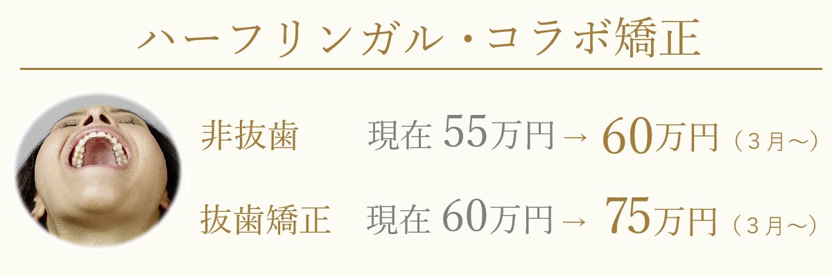 ハーフリンガル・コラボ矯正は3月~以下のように料金変更いたします。
