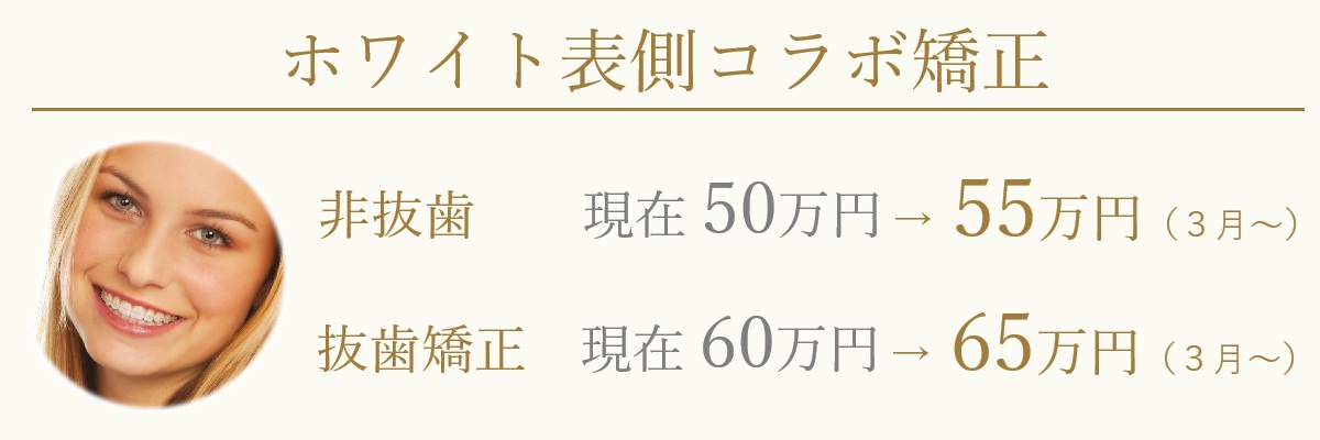 表側コラボ矯正は3月~以下のように料金変更いたします。